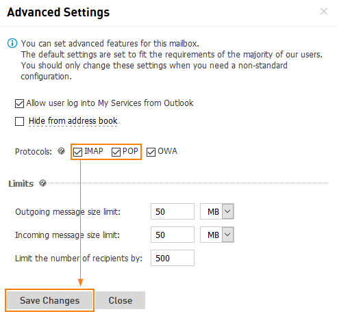- Assicurarsi che la casella di controllo POP3 (IMAP4) sia selezionata. Se le opzioni POP3 (IMAP4) non sono abilitate, selezionarle e fare clic sul pulsante Salva modifiche.