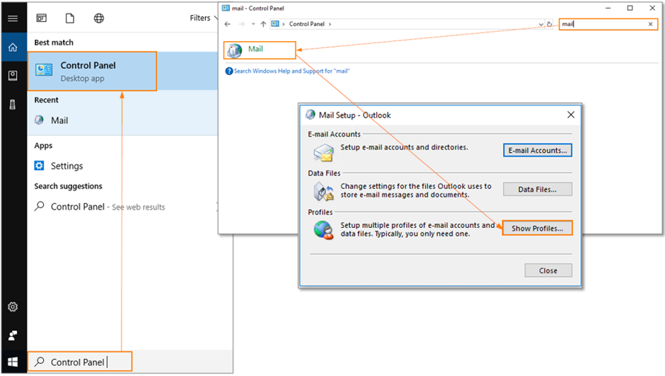- Accedere alle impostazioni di posta di Outlook da Start > Pannello di controllo > Posta.